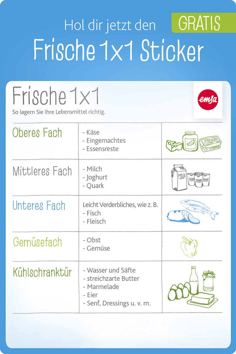 Einige wissen, dass es sie gibt. Andere haben noch nie davon gehört. Fakt ist aber: Jeder Kühlschrank hat verschiedene Klimazonen. Das heißt, jedes Fach bietet eine andere Temperatur und so die perfekte Umgebung für verschiedene Lebensmittel. In welches Fach Milch und in welches Fleisch kommt, findet ihr hier beim Frische 1×1 Sticker auf einen Blick. Erfahre hier mehr darüber, wohin welches Lebensmittel im Kühlschrank gehört.