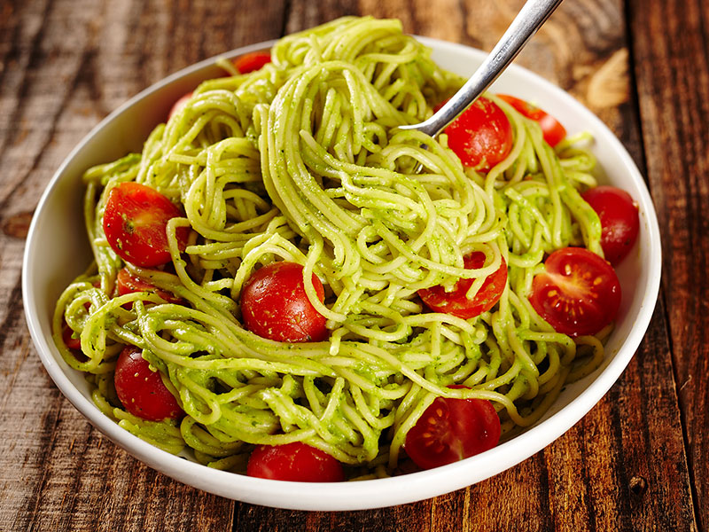 - Das Pesto schmeckt super zu Vollkornnudeln und kann mit etwas Parmesan abgerundet werden.