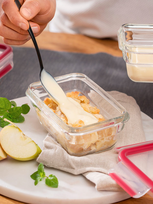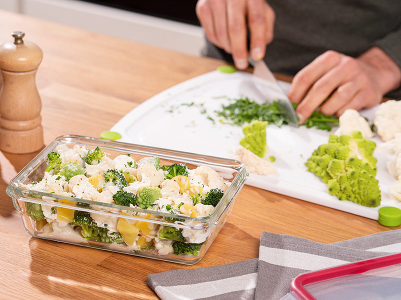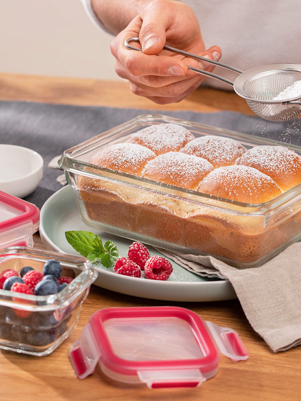 Ofengerichte eignen sich perfekt zum Meal-Prepping. Sprich: Es wird ganz einfach eine große Menge gekocht und das Gericht kann dann portionsweise in den passenden Frischhaltedosen eingefroren und frischgehalten werden. Wer pfiffig ist, kann den Auflauf auch schon in den richtigen Portionsgrößen backen. Die EMSA CLIP & CLOSE Glasdosen gibt es zum Beispiel auch in unterschiedlichen Größen. Durch diese Vielfalt klappt es so wunderbar, eine große Auflaufform und zwei kleinere mit dem Ofengericht zu befüllen und durchzubacken. Anschließend könnt ihr die große Auflaufform dann einfach auf den Tisch stellen und genießen und die beiden weiteren und kleineren Förmchen könnt ihr einfach auskühlen lassen, mit dem passenden Deckel verschließen und dann einfrieren. So hält sich der Auflauf noch wochenlang und schmeckt aufgetaut genauso gut.