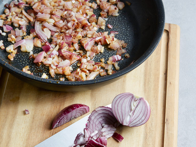 - Den Ofen auf 200 Grad vorheizen und parallel die Möhren und die Gemüsezwiebel in feine Würfel schneiden.