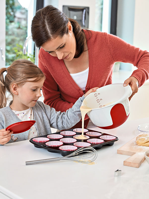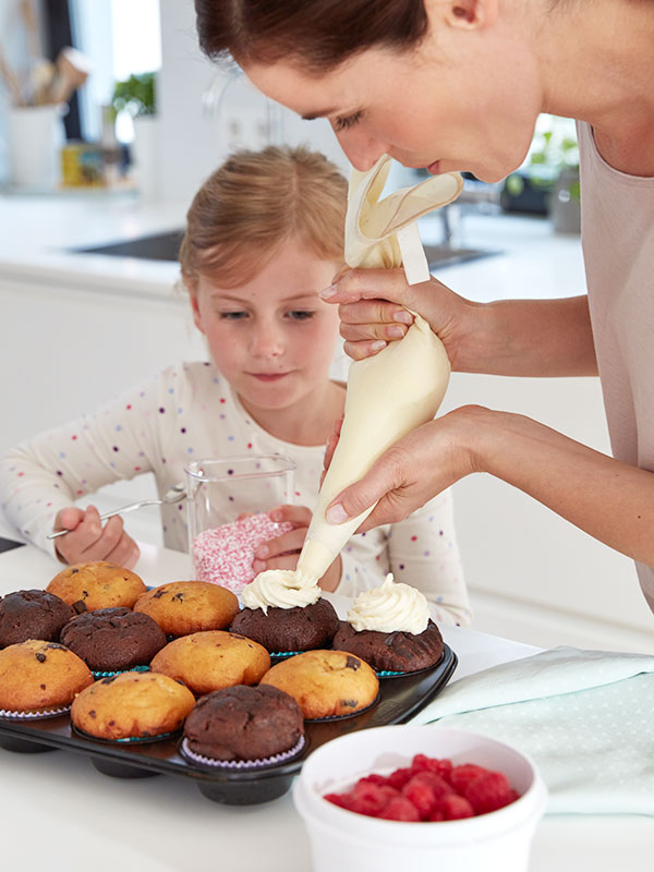 Es heißt, dass sie schon 1796 erstmals auftauchten, als Rezept in Amelia Simmons' Kochbuch American Cookery. Ganz offiziell angesagt waren sie allerspätestens, seit eine gewisse Carrie Bradshaw sich im US-Fernsehen im Jahr 2000 in der New Yorker Magnolia Bakery einen gönnte (was in Deutschland erst zwei Jahre später zu sehen war). Ein bisschen sind Cupcakes schon wie Muffins. Auch wenn die mit Pflanzenöl, statt weicher Butter zubereitet werden. Und natürlich nicht die verführerische Crème- oder Sahnehaube haben, die jeden Cupcake erst perfekt und zu einem echten Hingucker macht. Die kleinen Tassenkuchen bieten Bäckerin und Bäcker ähnlich viel kreatives Potenzial wie Cake Pops – sowohl was ihre inneren als auch äußeren Werte betrifft. Gebacken werden sie entweder im Muffin-Backblech (dem klassischen mit 12 Vertiefungen, obwohl man für Mini-Cupcakes natürlich auch zu einem mit 24 Mulden und für eine XXL-Version zu dem mit sechs greifen kann) oder Papierförmchen. Empfehlenswert ist aber tatsächlich eine Backform, da selbst die stärksten backofentauglichen Papierformen vom Backen nicht schöner werden und gerade auch bei Cupcakes das Auge ganz besonders mitisst. Eine Kunst für sich ist denn auch der sichere Transport des kunstvollen Naschwerks. Mit dem SUPERLINE Kuchenbehälter mit Kühlakku gelingt aber auch das kinderleicht! Und ansehnlich dazu.