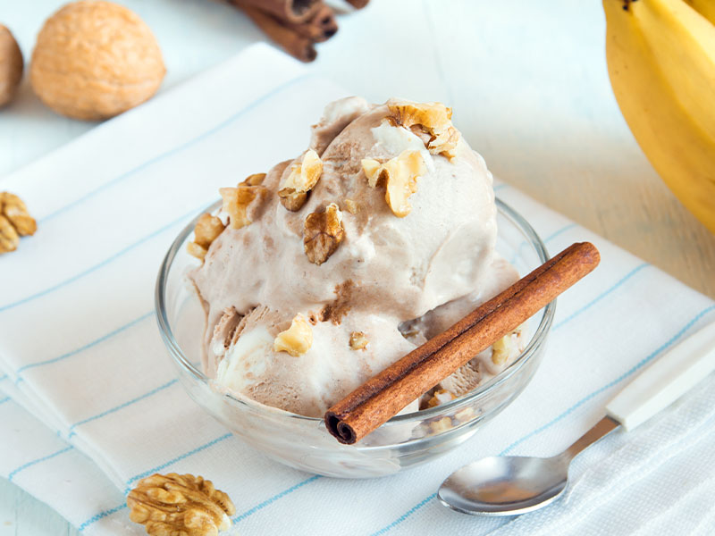 - Wenn das Eis fertig ist, kann es noch mit Nüssen oder anderen Toppings nach Belieben verfeinert werden.