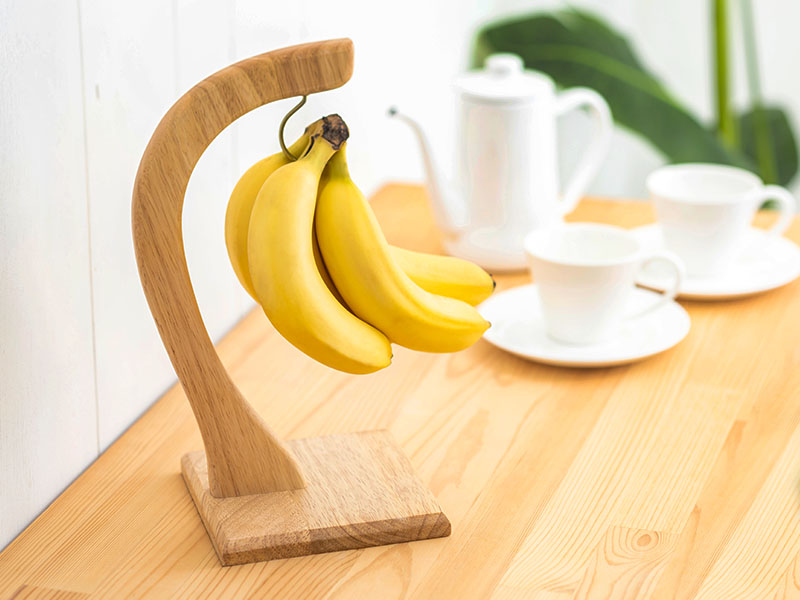 Geheimtipp: Damit Bananen noch langsamer reifen und braune Flecken vermieden werden, können sie an Bananenhaltern oder Küchenharken aufgehängt werden. So werden die Früchte auch von lästigen Druckstellen oder Obstfliegen bewahrt.