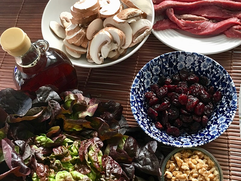 - Ein paar Cranberries und Walnussstückchen zum Dekorieren beiseitelegen, den Rest gründlich mit dem Salat vermischen. Mit den Champignons dann genauso verfahren. Den Salat auf Tellern anrichten, die Rindfleischstreifen darauf drapieren und mit den restlichen Pilzen, Nüssen und Beeren dekorieren. Enjoy!