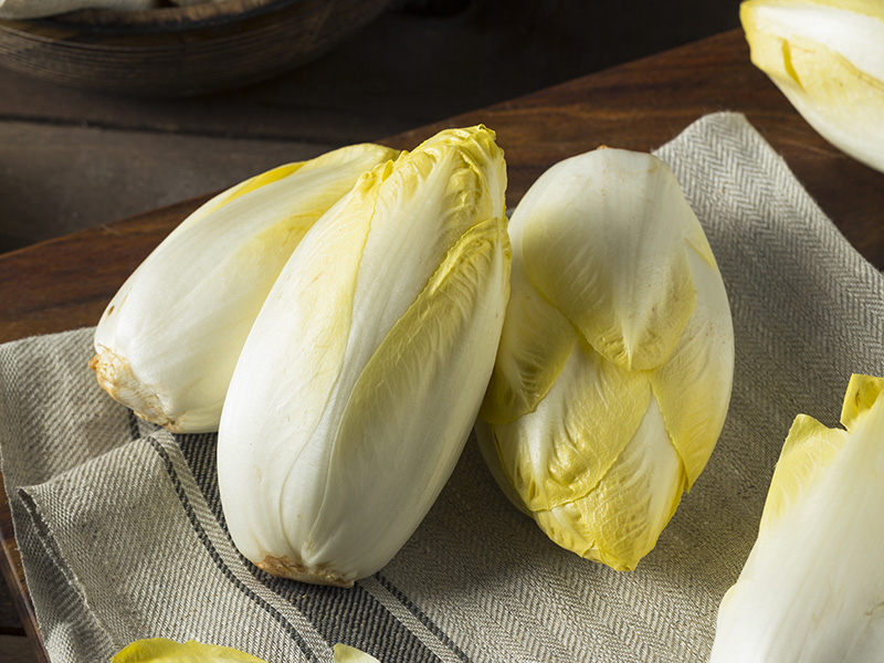 Der Blasse. Vom unschuldigen Aussehen seiner länglich-ovalen, weißlichen Blätter mit den zartgelben Spitzen sollte man sich aber nicht täuschen lassen: Dank des Bitterstoffs Intybin (der auch in Endiviensalat enthalten ist) hat Chicorée es geschmacklich ganz schön in sich! Sein herbes Aroma muss man mögen. Auf jeden Fall die Finger lassen sollte man von Chicorée mit grünen Spitzen – der schmeckt einfach nur noch unangenehm bitter. Damit dieser ursprünglich aus Belgien stammende Salat seine noble Blässe behält, wird er während des Wachstums mit schwarzer Folie abgedeckt. Chicorée schmeckt nicht nur roh, sondern auch gedünstet ganz hervorragend und zählt zu den klassischen Wintersalaten, da seine Wurzeln Kälte vor dem Austreiben brauchen. Freiland-Saison ist daher für ihn von Oktober bis April.
