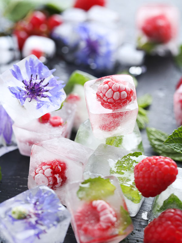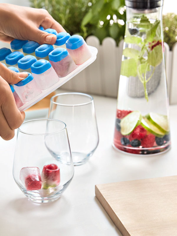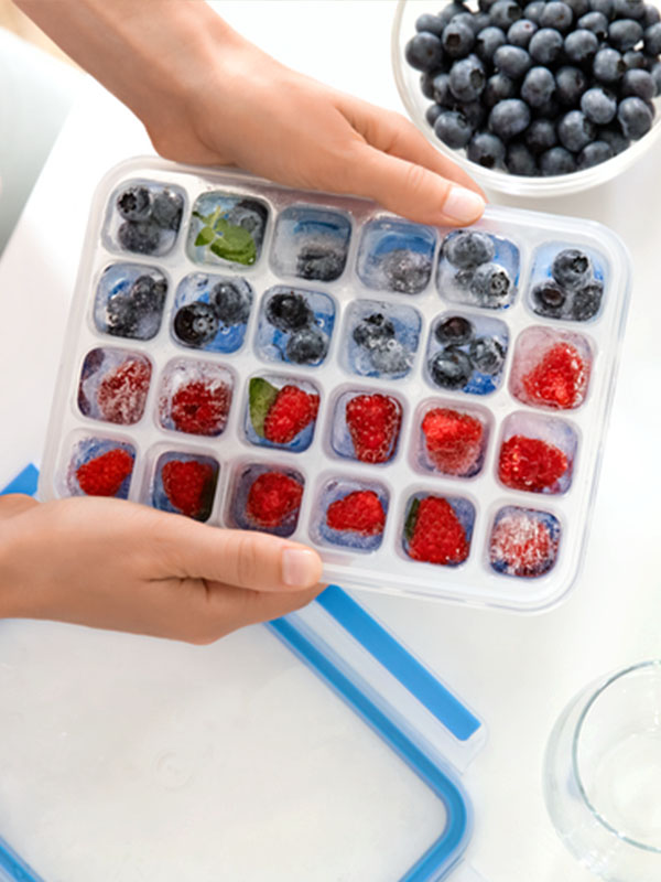 Um eure frischen Getränke noch mehr aufzupeppen, kann zu einigen natürlichen „Geschmacksverstärkern“ gegriffen werden. Mit ihnen werden eure Cocktails sogar noch aromatischer. Ein erstes leckeres Highlight in euren Cocktails sind bunte Eiswürfel, gefüllt mit Obst eurer Wahl. Dazu einfach Wasser in eine Eiswürfelform, wie zum Beispiel der CLIP & CLOSE Eiswürfelform geben und Himbeeren, Heidelbeeren, Brombeeren oder auch Minze hineinlegen. Danach einige Zeit in den Gefrierschrank legen und die fertigen Eiswürfel in euer Getränk kippen. Neben den gefrorenen Früchten in Eiswürfeln, können aber auch frische Früchte verwendet werden. Dazu einfach Früchte auswählen und in kleine Stücke oder Scheiben schneiden. Diese dann einfach an den Rand des Glases hängen oder auf einen Spieß aufspießen und als kleinen Snack neben dem Drink genießen.