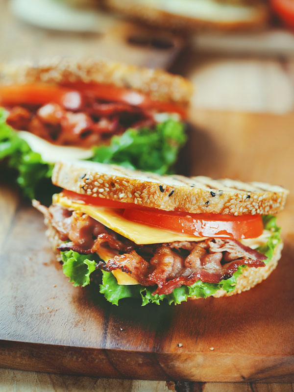 - Der Speck wird dann auf den Tomaten platziert und die letzten zwei Toastscheiben kommen oben auf das belegte Sandwich.