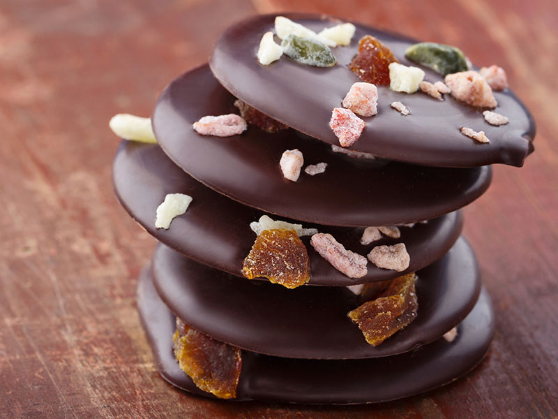 Abends auf dem Sofa und die Lust auf Schokolade ist einfach so groß? Schokolade ist nicht per se eine absolute Sünde. Dunkle Schokolade mit einem sehr hohen Kakaoanteil von mindestens 70 enthält weniger Zucker als Vollmilchschokolade und ist deshalb eine gute Alternative. Leckere Zartbitterschokolade zusammen mit Mandeln, Haselnüssen, Cranberries oder (Trocken-) Obst ist zwar süß und enthält auch Zucker, ist aber durch pflanzliche Inhaltsstoffe immer noch besser als Chips, Gummibären und Co. Man nehme: