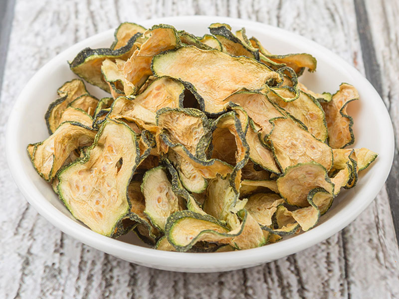 - Die Zucchinischeiben mit dem Meersalz bestreuen und für etwa 2-3 h bei etwa 90 ° C backen, je nach Dicke der Scheiben.
