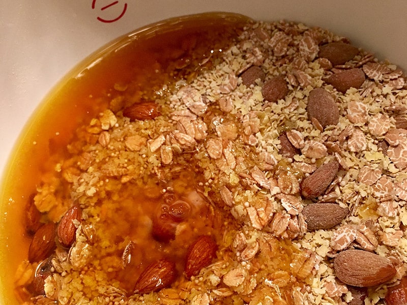 - Das gezuckerte Öl dazugeben geben und alles sehr gut durchmischen (so lange, bis alle trockenen Zutaten mit dem Öl überzogen sind).