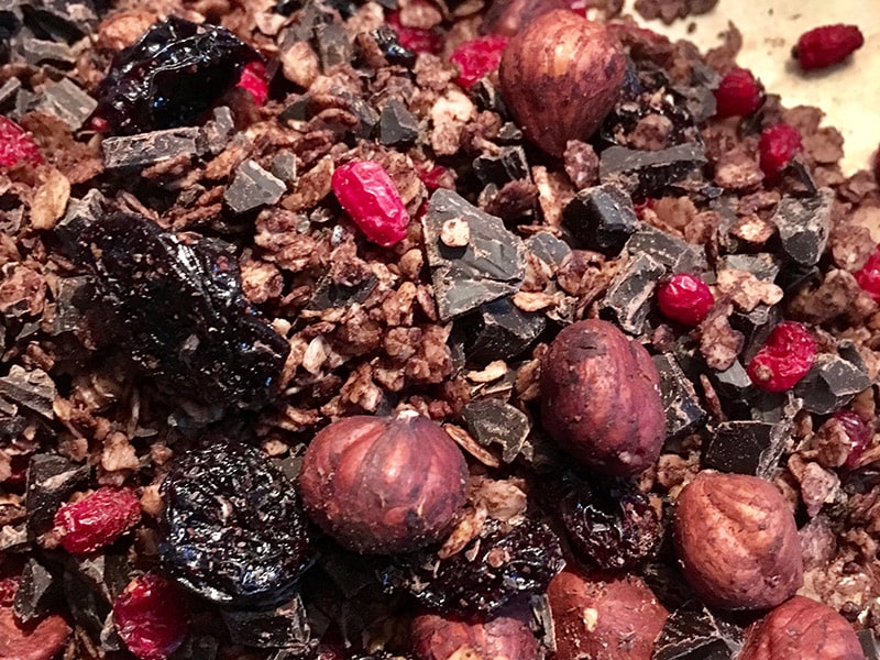- Abkühlen lassen. Währenddessen die Schokolade hacken. Sobald die Granola kalt ist, zerbröseln und Schokolade, Kirschen und Berberitzen noch untermischen.