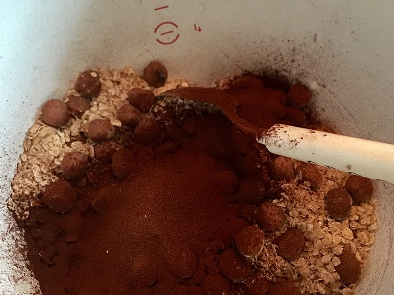 - Alle trockenen Zutaten bis auf die Früchte (also Haferflocken, Haselnüsse, Chia, Kakao und Salz) in einer Schüssel miteinander mischen.