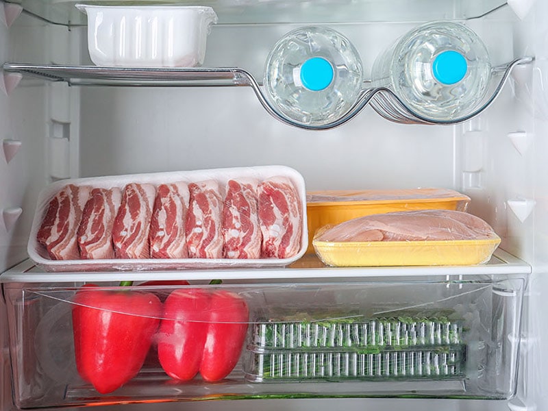 Unterstes Fach (durch Glasplatte abgetrennt vom Gemüsefach), 2 – 3 °C: Fisch, Meeresfrüchteprodukte, Fleisch und Wurst