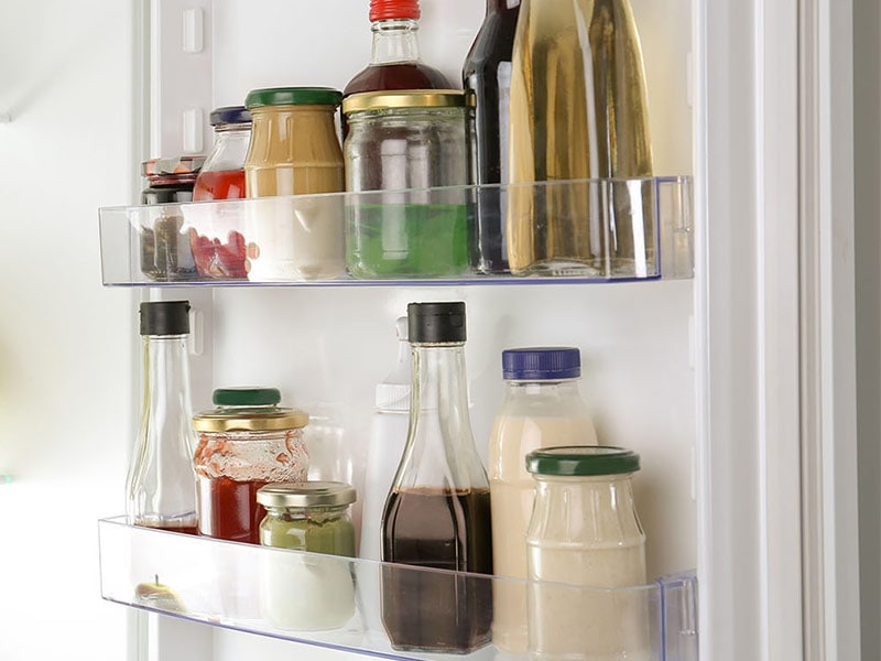 Türfach, 9 – 14 °C: Butter, Eier, Marmelade (die alternativ auch ins oberste Fach kann), Dressings, Ketchup, Senf, Saucen, Getränke