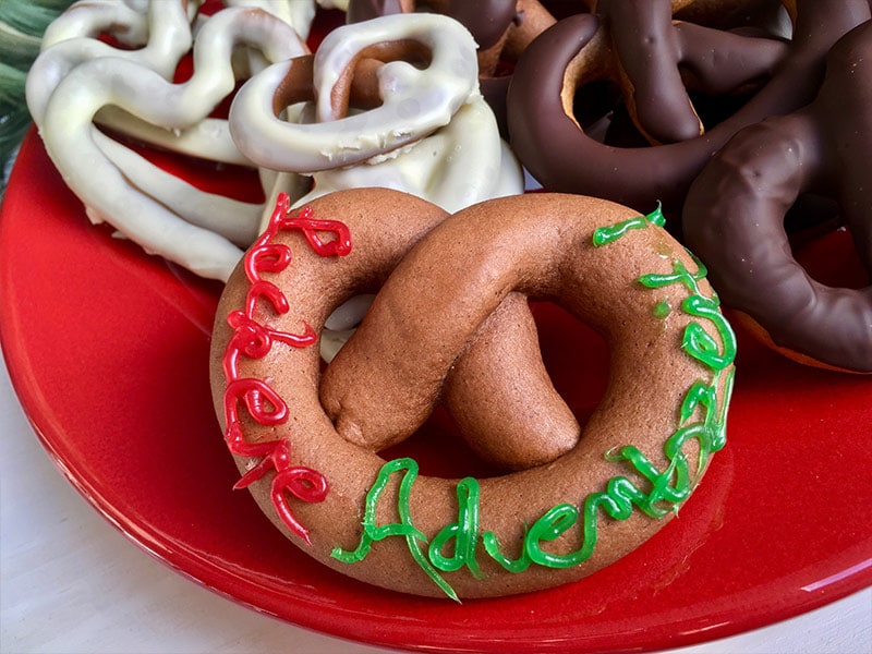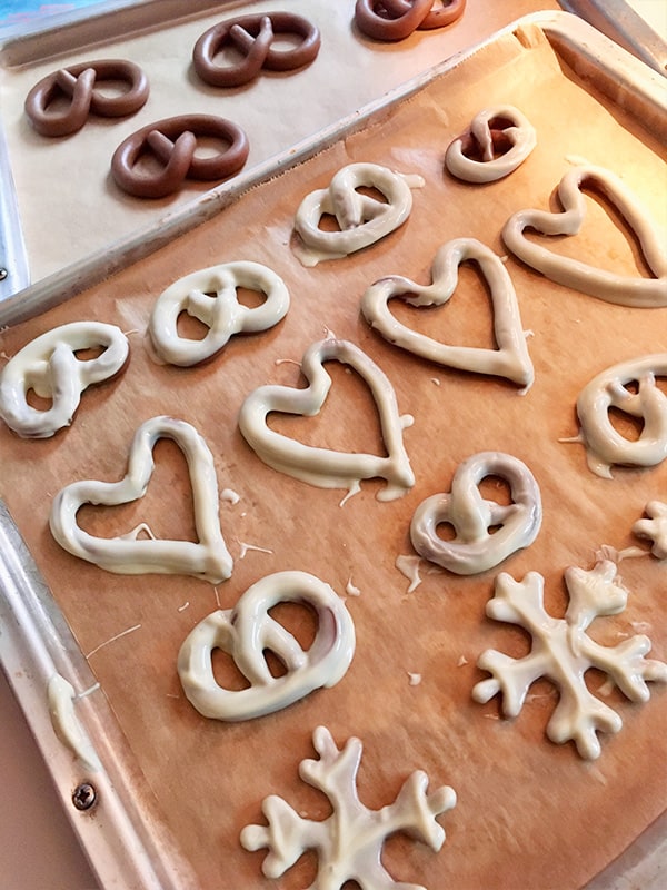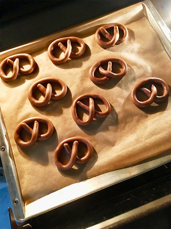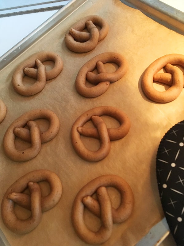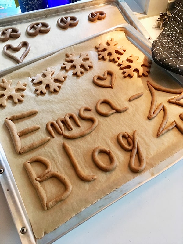 - Den Teig dann portionsweise auf einer leicht bemehlten Fläche 0,5 – 1 cm dick ausrollen und mit Förmchen ausstechen resp. mit einem Messer in die gewünschte Form schneiden. Oder mit den Händen zu ebenfalls ca. 0,5 – 1 cm dicken Teigsträngen rollen und diese zu Brezeln, Herzen, Buchstaben u. Ä. geformt auf das Backblech legen. Für die klassische Brezelform habe ich jeweils eine ungefähr pflaumengroße Menge Teig (knapp 50 g pro Portion) genommen und mit den Händen 25 – 30 cm lang ausgerollt.