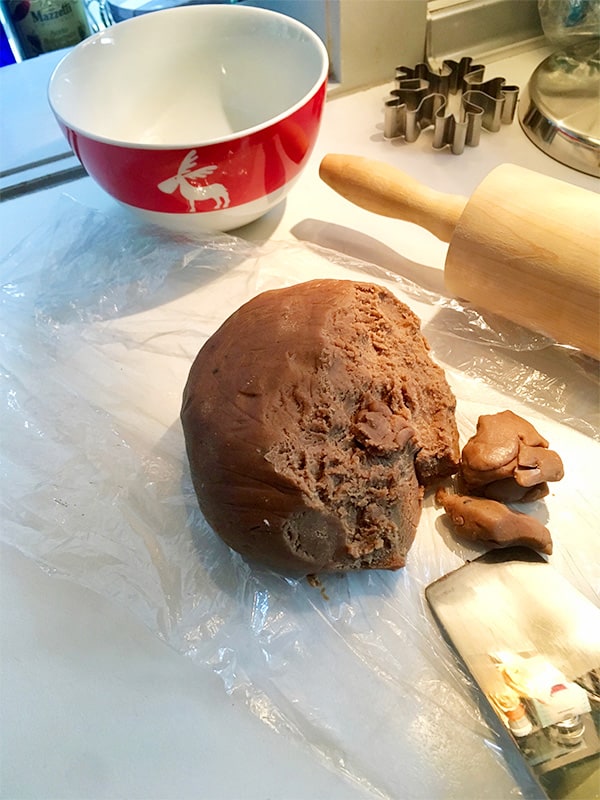 - Die Pottasche unter Rühren in 2 – 3 EL Wasser auflösen. In der Küchenmaschine oder mit den Knethaken des Handrührgeräts in einer großen Schüssel mit festem Stand (sh. Tipp weiter unten) Butter, Mehl, Eier, Pottasche, sämtliche Gewürze (sowie ggf. die zusätzlich aromatisierende Flüssigkeit) und die Honig-Zucker-Masse zu einem glatten festen Teig verkneten. (Ich habe mit den Knethaken angefangen und irgendwann einfach mit den Händen weitergemacht.) In Frischhaltefolie wickeln und mindestens 8 Stunden im Kühlschrank ruhen lassen.