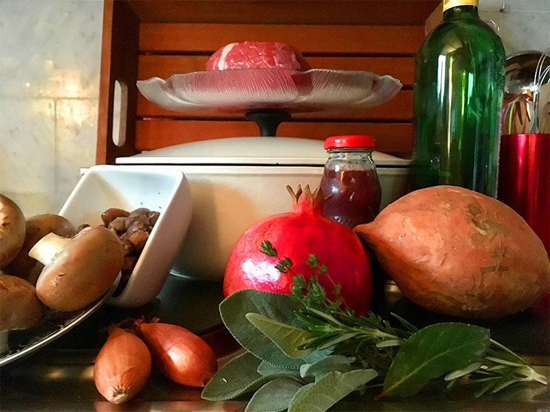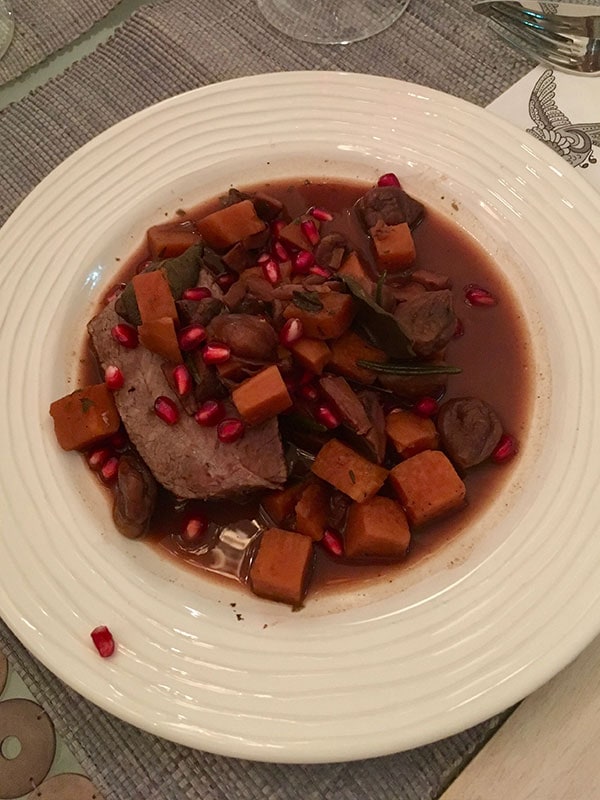 - Nach Ende der kompletten Garzeit das Fleisch aus dem Topf nehmen und in Scheiben schneiden. Die Jus evtl. nochmals final mit Salz, Pfeffer und Kreuzkümmel abschmecken. Die Fleischtranchen auf vorgewärmte Teller geben und mit dem Süßkartoffel-Champignon-Maronen-Mix samt Jus anrichten. Noch ein paar Granatapfelkerne darüber streuen und – genießen.