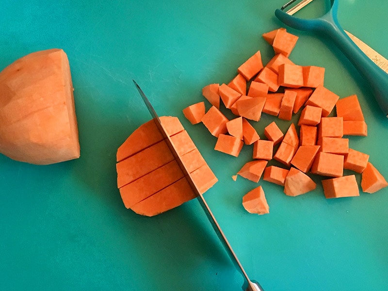 - Die Süßkartoffel(n) schälen und in Würfel schneiden. Die Schalotten schälen und der Länge nach in feine Streifen schneiden.
