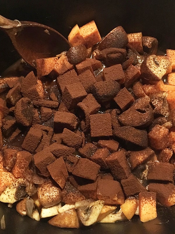 - Noch 1 EL Rapsöl im Schmortopf erhitzen und darin unter Rühren die Schalotten ebenfalls scharf anbraten. Mit dem Granatapfelsaft ablöschen, die Champignons und Süßkartoffeln dazugeben. Den Kakao darüber sieben, alles gut durchmischen und aufkochen lassen.