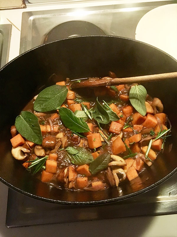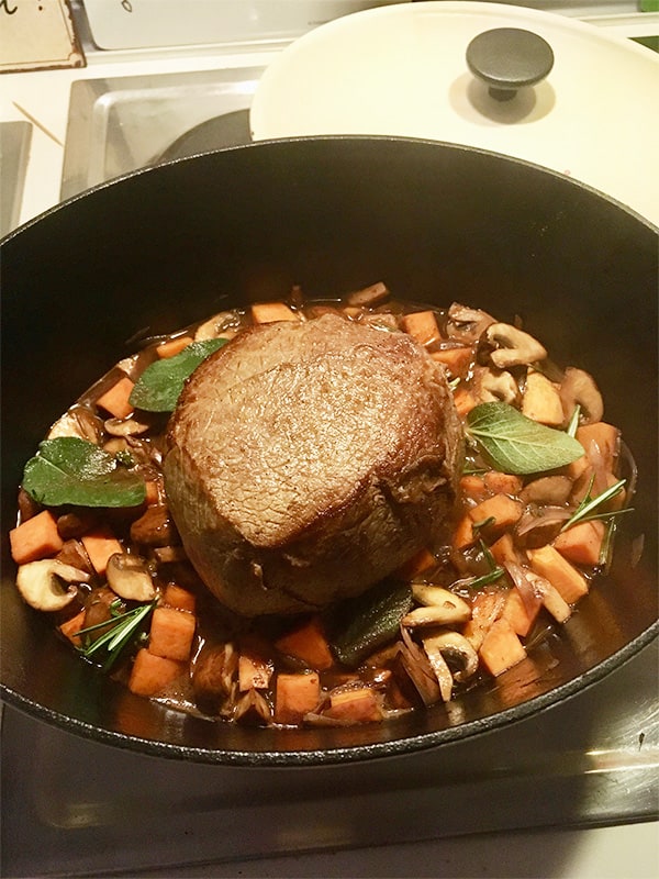 - Mit einem Schuss Rotwein abschmecken und die Kräuter einstreuen. Das Fleisch darauf betten, den Deckel auf den Topf legen und ab damit für 1,5 Stunden in den vorgeheizten Ofen.