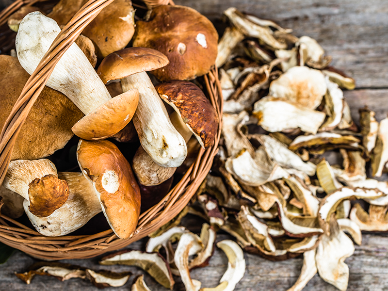 Pilze: Fein trocken putzen und bei 40 bis 50 Grad bis zu vier Stunden backen.