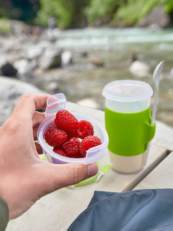 - In den Deckel des to go Bechers könnt ihr dann ideal frische Früchte oder auch Toppings mitnehmen, die ihr euch unterwegs dann frisch und knackig auf eure Overnight Oats gebt.