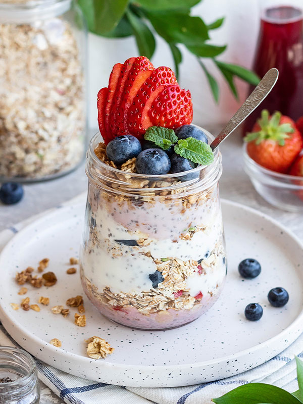 - Nun mischt ihr diese beiden Zutaten in einem Gefäß zusammen. Wenn ihr die Overnight Oats am nächsten Tag mit ins Büro mitnehmen möchtet, dann empfehlen wir euch den CLIP & GO Yoghurt Mug. Ihr füllt die Haferflocken und die Milch einfach herein und den Rest erledigt der Kühlschrank.