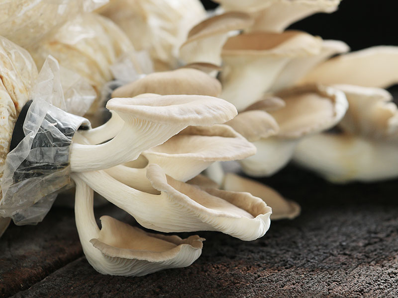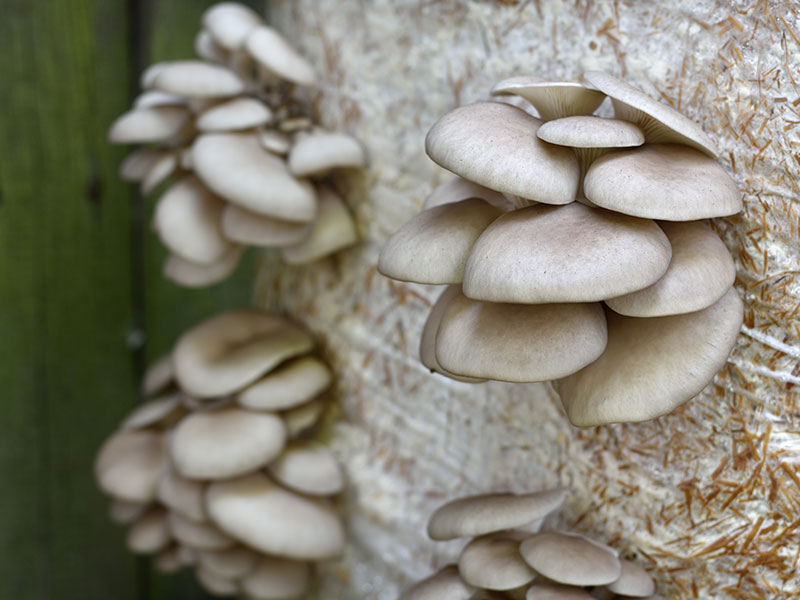 Zum Pilzanbau benötigt man zunächst ein geeignetes Substrat, mit dem die Pilzbrut versetzt werden kann. Bei Hut und Stiel besteht dieses fast zur Gänze aus Kaffeesatz. Diesen holt das Start-up von Cafés, Restaurants, Hotels und Seniorenheimen per Lastenfahrrad ab. Mit Myzel und Kaffeebohnenhäutchen vermengt, wird das Substrat in Plastiksäcke gefüllt und auf Schienensystemen aufgehängt. Bei mindestens 24 Grad und Dunkelheit fangen die Pilze in den Säcken an zu wachsen. Sobald sichtbar ist, dass sich ein Pilz bildet, schneiden Bornbaum und Hofer kleine Löcher in die Säcke. So finden die Seitlinge ihren Weg nach draußen. Nach etwa drei Wochen werden sie in die sogenannte Aufzuchtstation umgehängt, wo die Pilze bei 15 Grad und Licht sprießen. Die Ernte führt Hut und Stiel pro Sack dreimal durch.