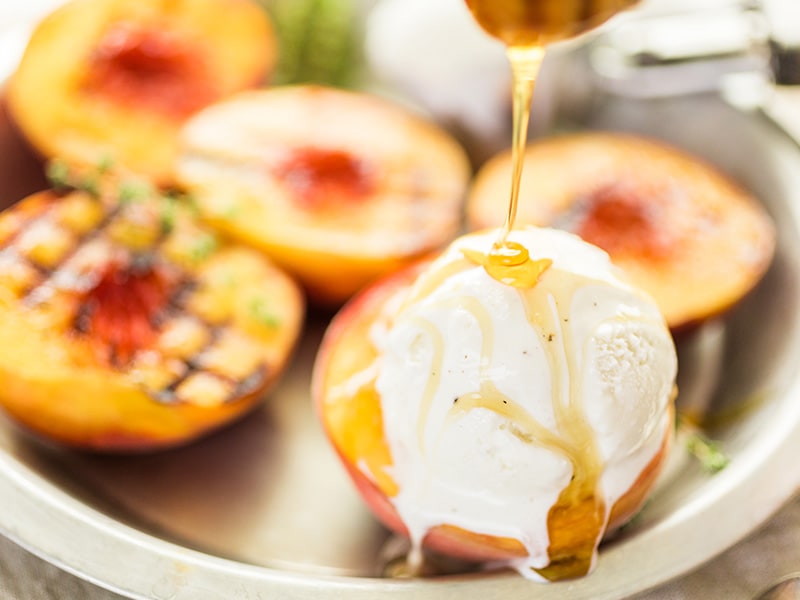 Nachdem ihr euch schon den Spargel schmecken lassen habt, darf ein kleines Dessert natürlich nicht fehlen. Bei vegetarischem Grillen muss es sich nämlich nicht zwangsläufig nur um gegrilltes Gemüse handeln. Auch verschiedene Obstsorten machen eine gute Figur auf dem Grill. Wie wäre es beispielsweise mit einem saftigen Pfirsich mit leckerem Vanilleeis?