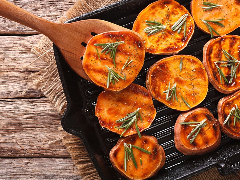 - Kartoffeln gründlich waschen und in Scheiben schneiden. Rosmarin waschen, trocknen und Nadeln grob abzupfen. Kartoffeln und Rosmarin mit Salz, Pfeffer und Öl vermengen. Auf dem heißen Grill bei 150 °C ca. 25-30 Minuten grillen.