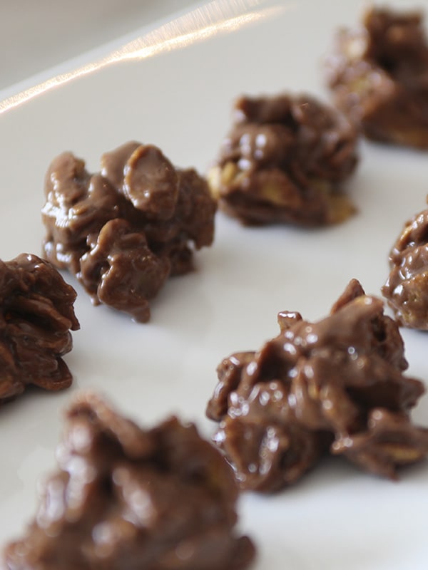 - Jetzt mit einem Löffel kleine Schokocrossies aus der Masse formen und auf Backpapier zum Abkühlen legen. Wer lieber große Schokocrossies möchte, kann die Masse auch in Muffin-Förmchen füllen.