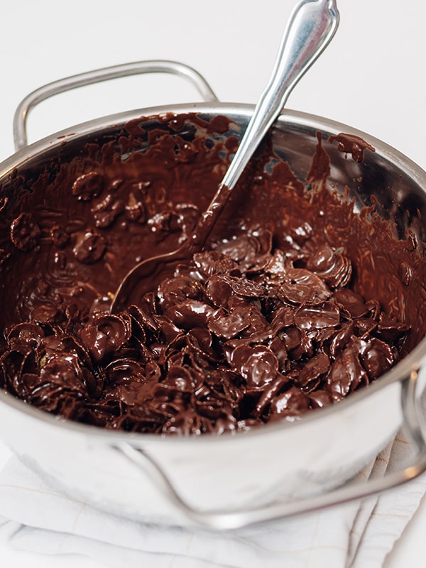 - Wenn die Butter und Schokolade komplett aufgelöst sind und eine teigähnliche Flüssigmasse ergeben, den Topf aus dem Wasserbad entnehmen und die Cornflakes unterrühren. Die Menge der Cornflakes variiert je nach Geschmack, allerdings sollten es nicht zu wenig sein, da die gehärtete Schokolade später schwer zu kauen ist.