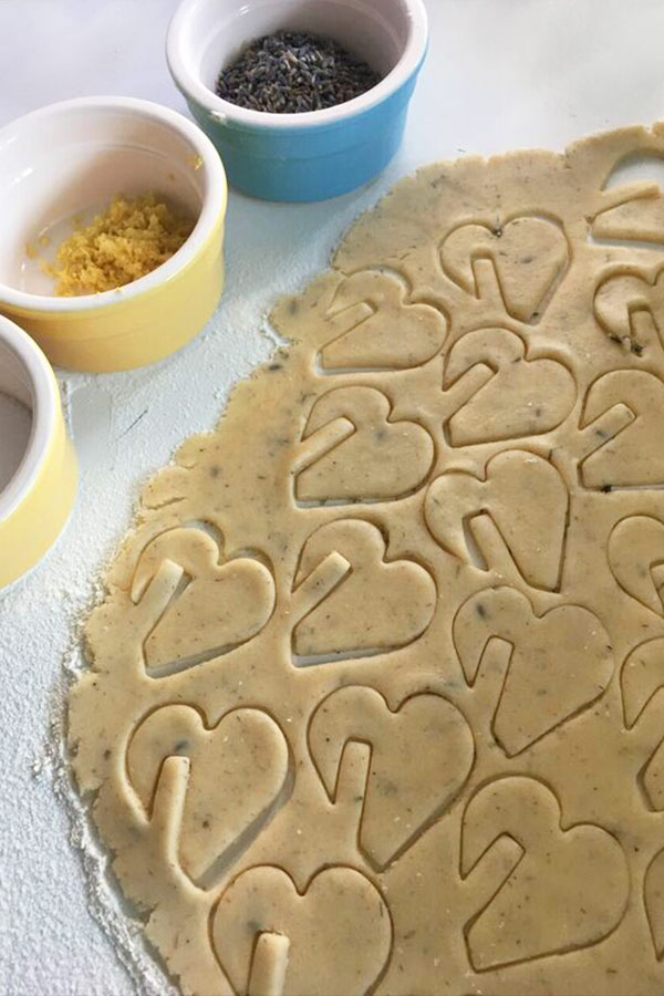 - Den Teig auf einer leicht bemehlten Fläche dünn ausrollen und einzelne Kekse ausstechen (oder ausschneiden). Auf das Blech legen und jeden Keks mit etwas Zucker, Zitronenabrieb und vereinzelten Lavendelblüten bestreuen.