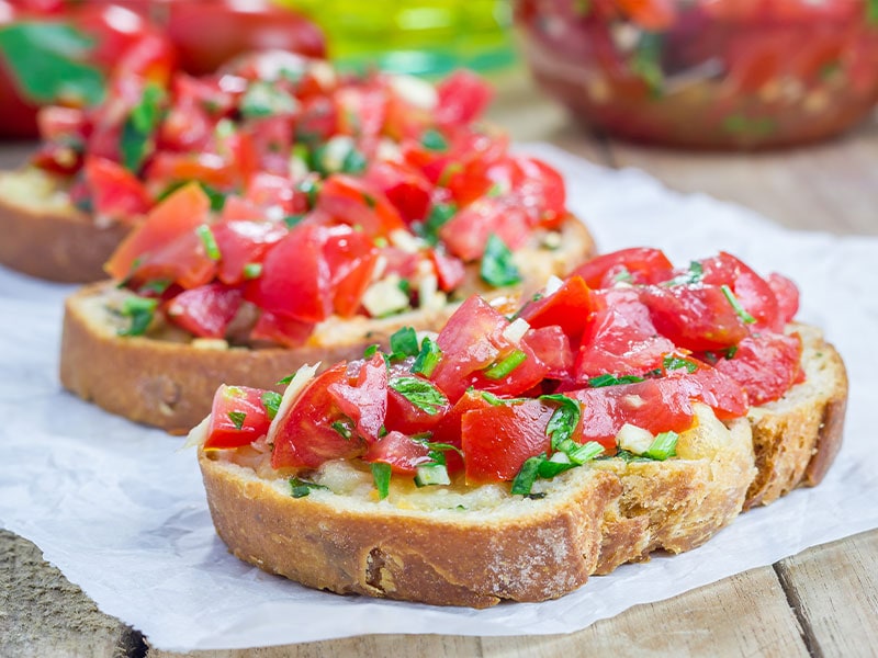 - Tomaten, 5 EL Olivenöl, Basilikum und andere Gewürze miteinander vermischen und alles portionsweise auf das angebratene Brot geben. Gegebenenfalls nach Belieben nachwürzen.