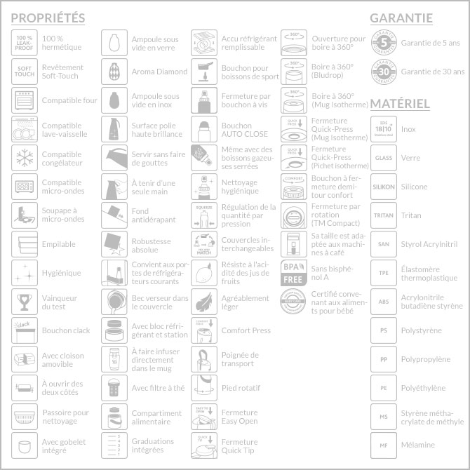 Chaque pictogramme a une signification : pour usage alimentaire, compatible lave-vaisselle, compatible congélateur, etc.