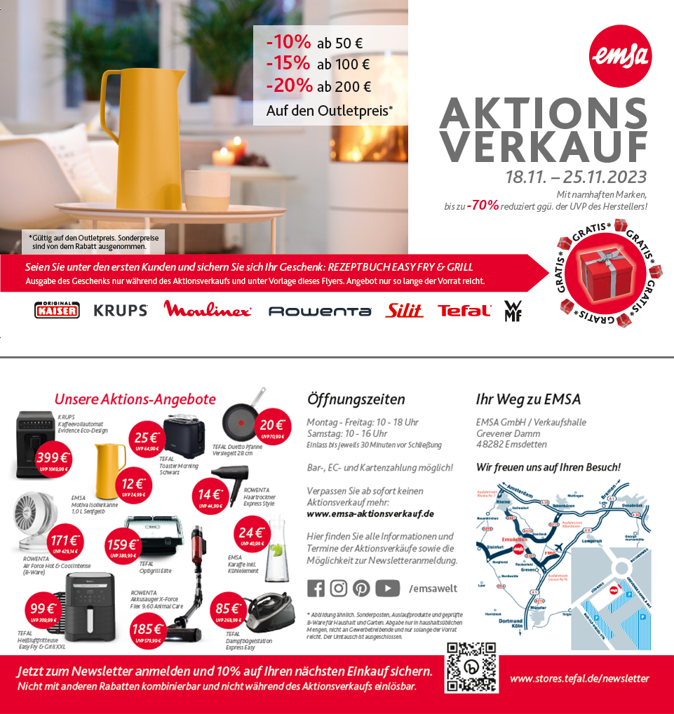 Vom 18.11. - 25.11.2023 ist es wieder soweit: Unser Aktionsverkauf startet mit vielen namhaften Marken. Ein Besuch lohnt sich: Die Produkte sind bis zu 70% (gegenüber der UVP des Herstellers) reduziert. Eine Bar-, EC- und Kartenzahlung ist möglich. Unser Aktionsverkauf findet in unserem neuen Werksverkauf statt.